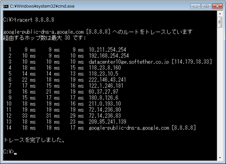 サーバーを経由した通信が行われていることを確認するには、Windows のコマンドプロンプトから「tracert