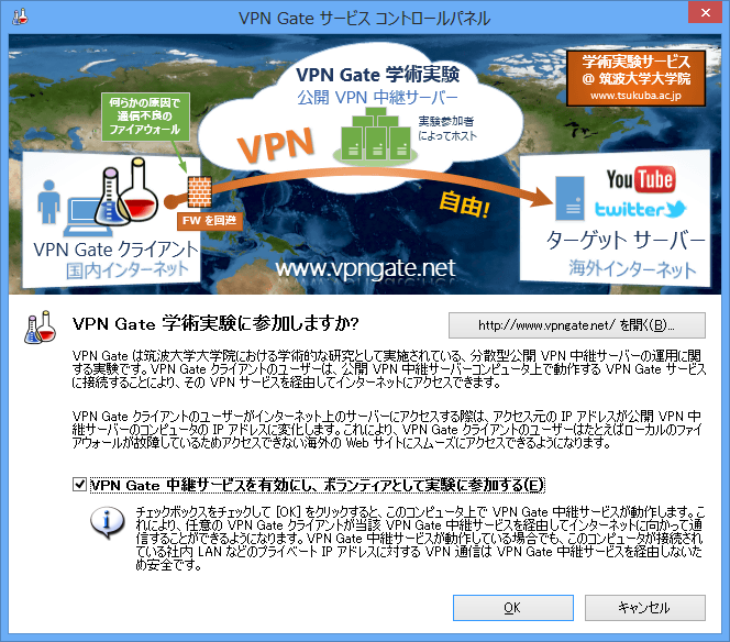 上記の「VPN Gate 中継サービスを有効にし、ボランティアとして実験に参加する」(デフォルトで